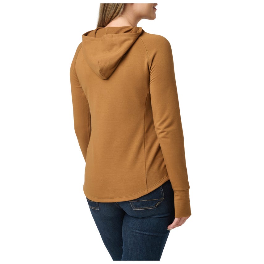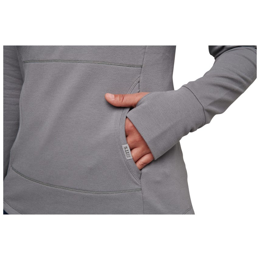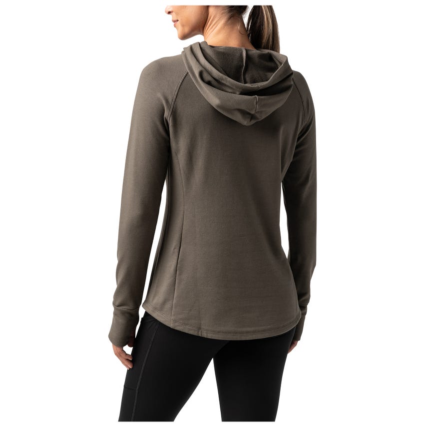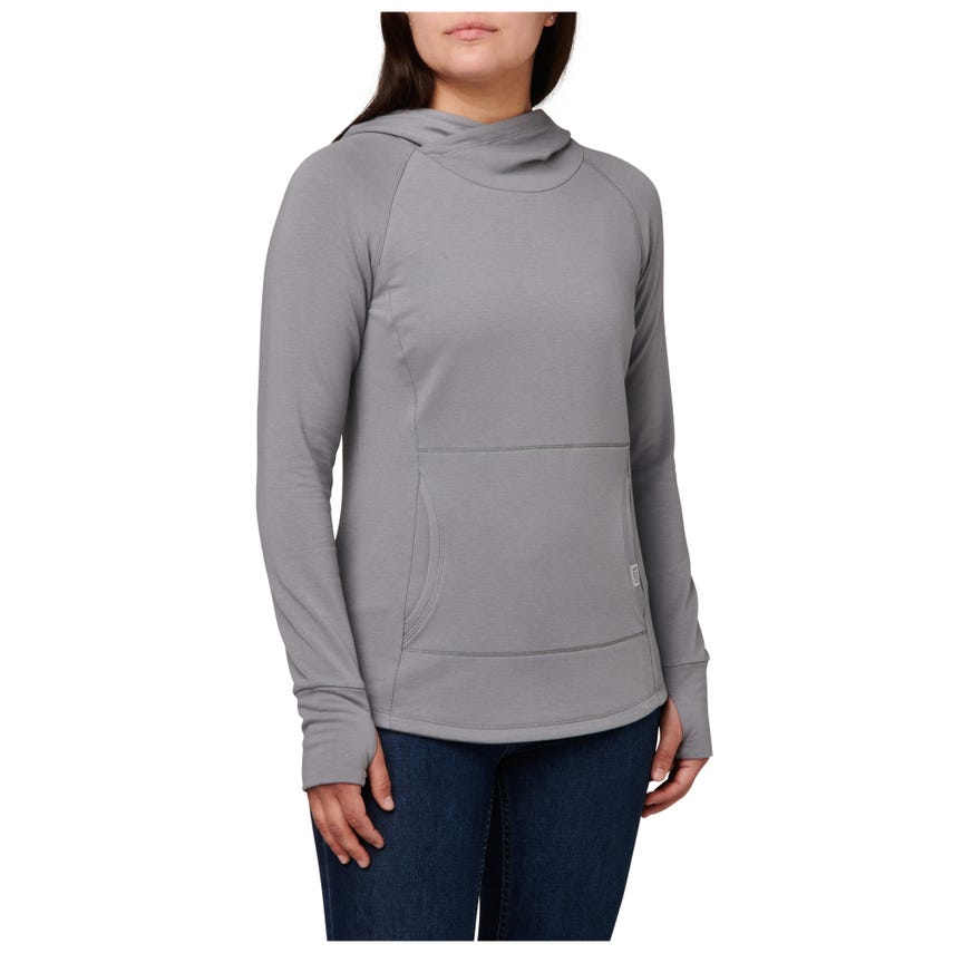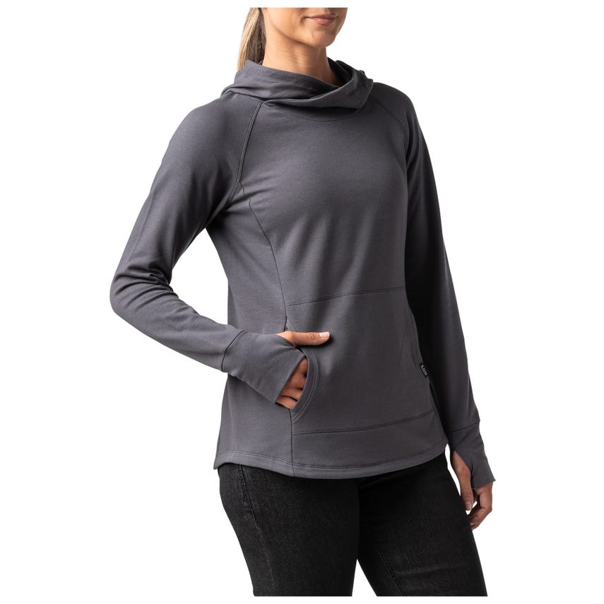 Comfort and utility combined with a unique cross-over opening for warmth and style. The Donna Hoodie is lightweight, durable, and visually appealing. The moisture wicking fabric keeps you dry while thumbholes at the sleeve cuffs and kangaroo front pocket keep your hands warm and cozy. Imported.