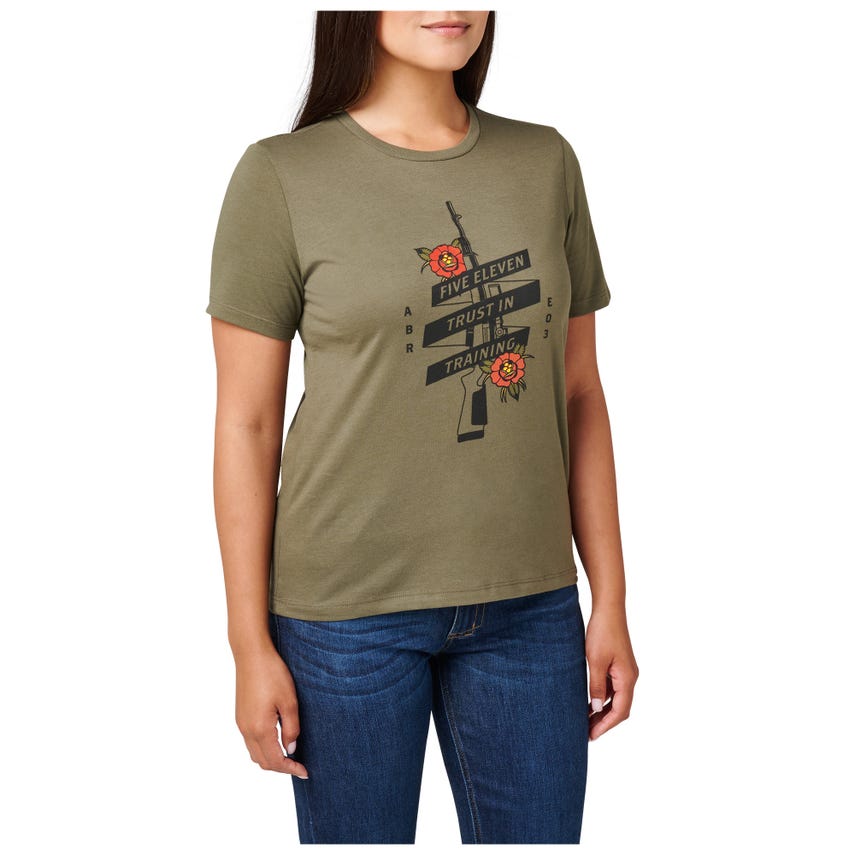 Show your strength with the Women's Strong Aim Tee by 5.11 Tactical. This cheeky design features roses and directional arrows with the bold statement "Five Eleven Trust in Training," blending floral elegance with tactical flair. Crafted from ringspun cotton/poly blend, it promises comfort while resisting the test of time. Embrace empowerment with a touch of humor in every wear.