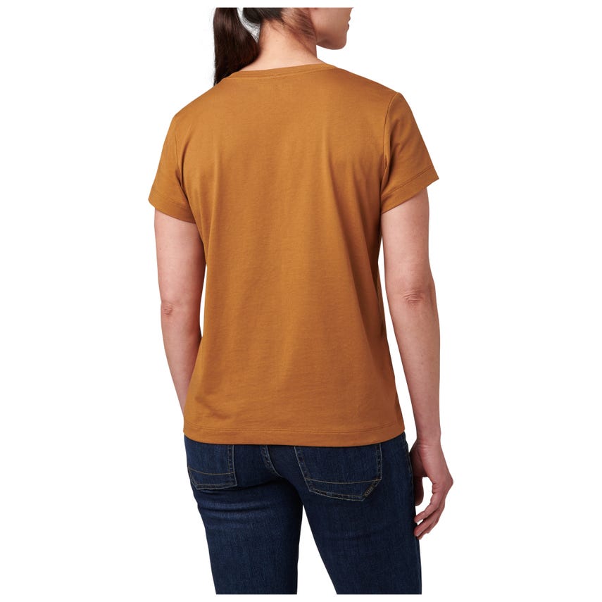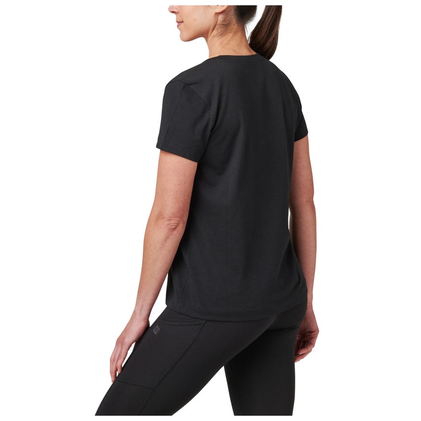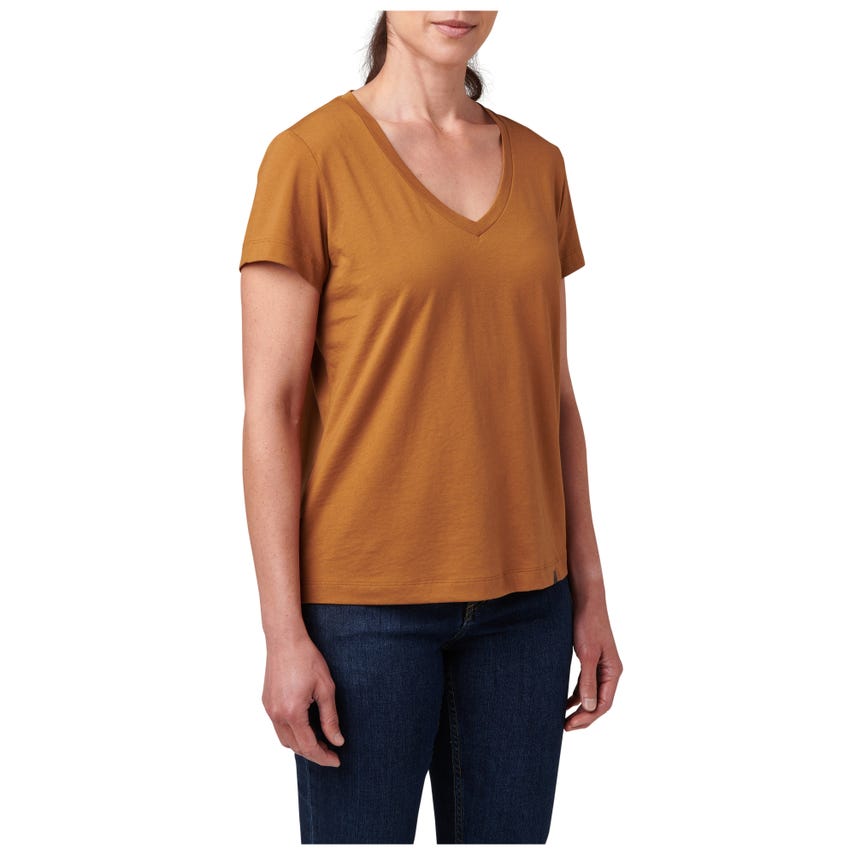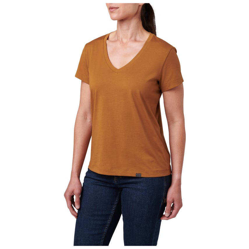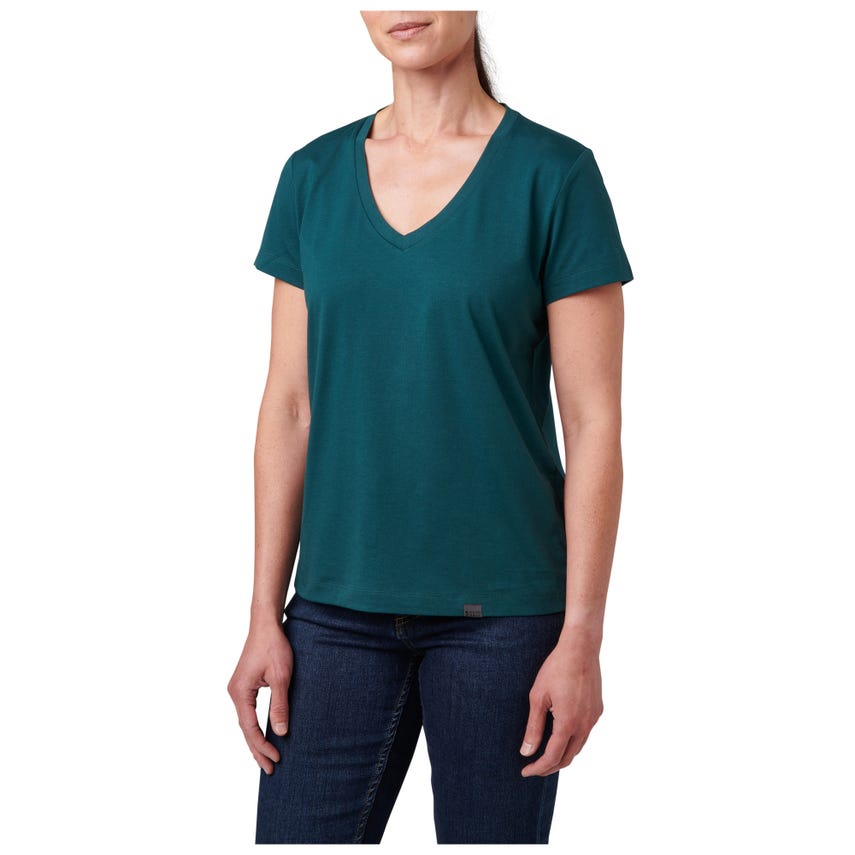 Meet your favorite new V-neck top. The wicking properties of our Essential V-Neck Short Sleeve Tee make it ideal for a variety of activities. The classically styled V-neck is made from a comfortable 60% cotton and 40% polyester blend that's lightweight and renowned for pulling sweat away. A 5.11[+]庐 clip label finishes out the straight hem - which is the perfect length for concealed carry. The Essential V-Neck Short Sleeve Tee can be worn tucked or untucked, by itself or as a layer underneath a button-up shirt. It pairs easily with 5.11庐 jeans, pants, and shorts.