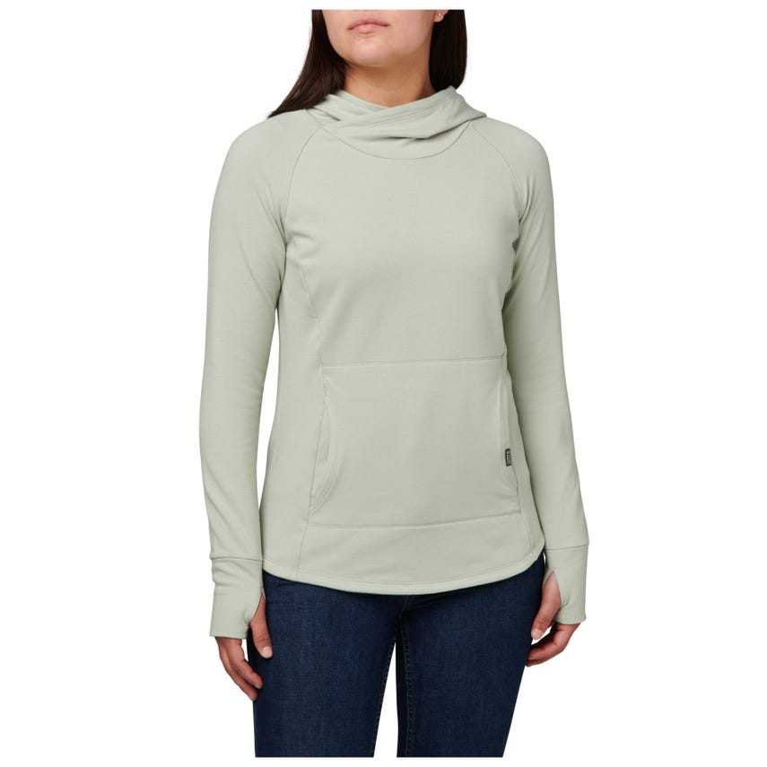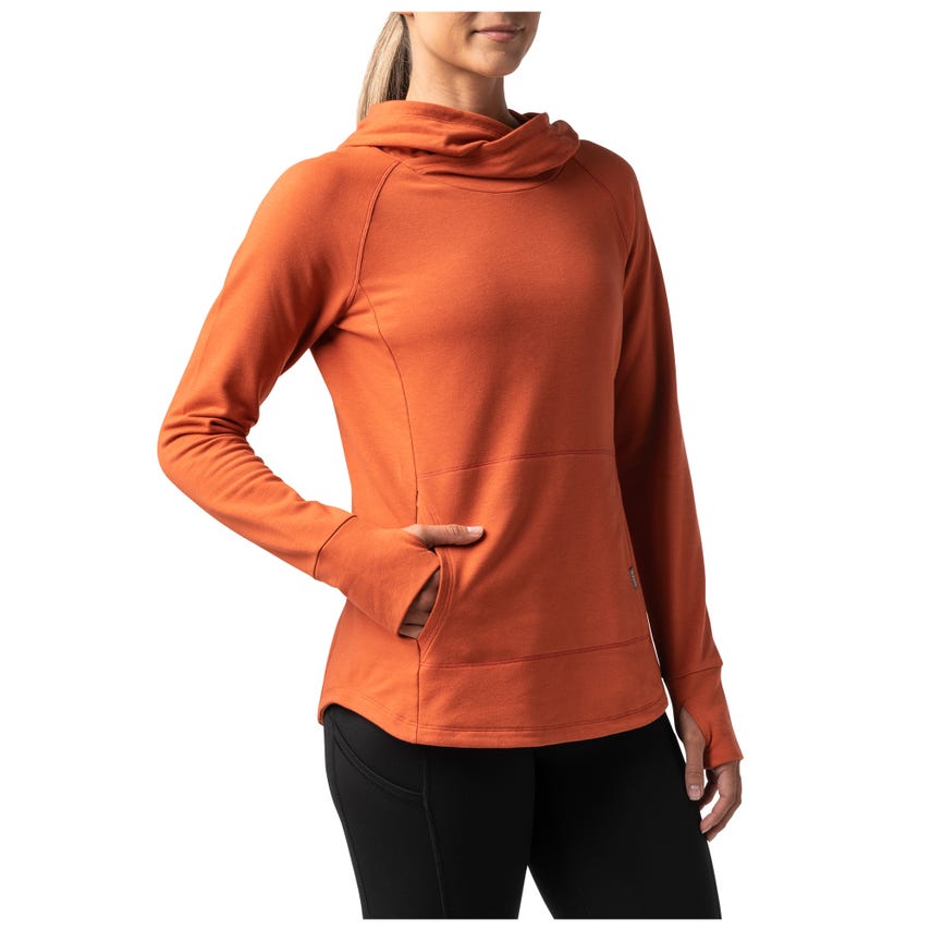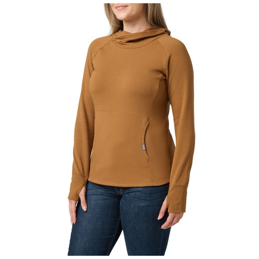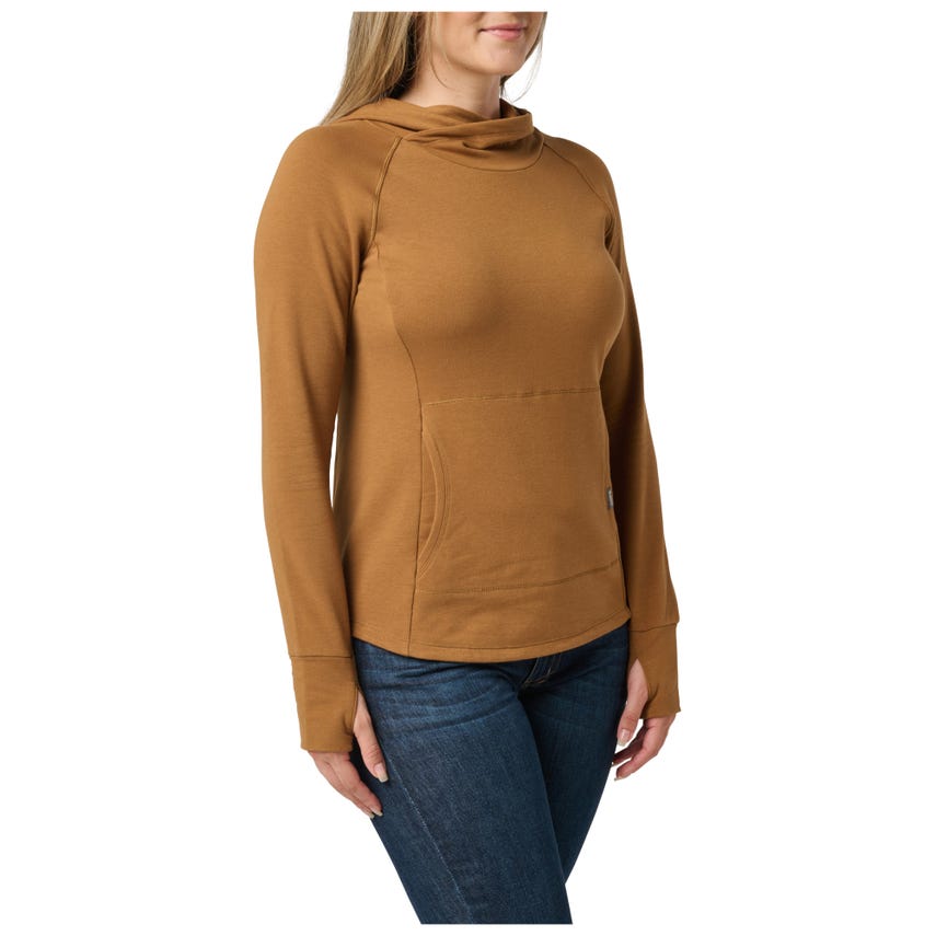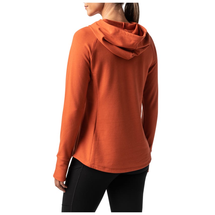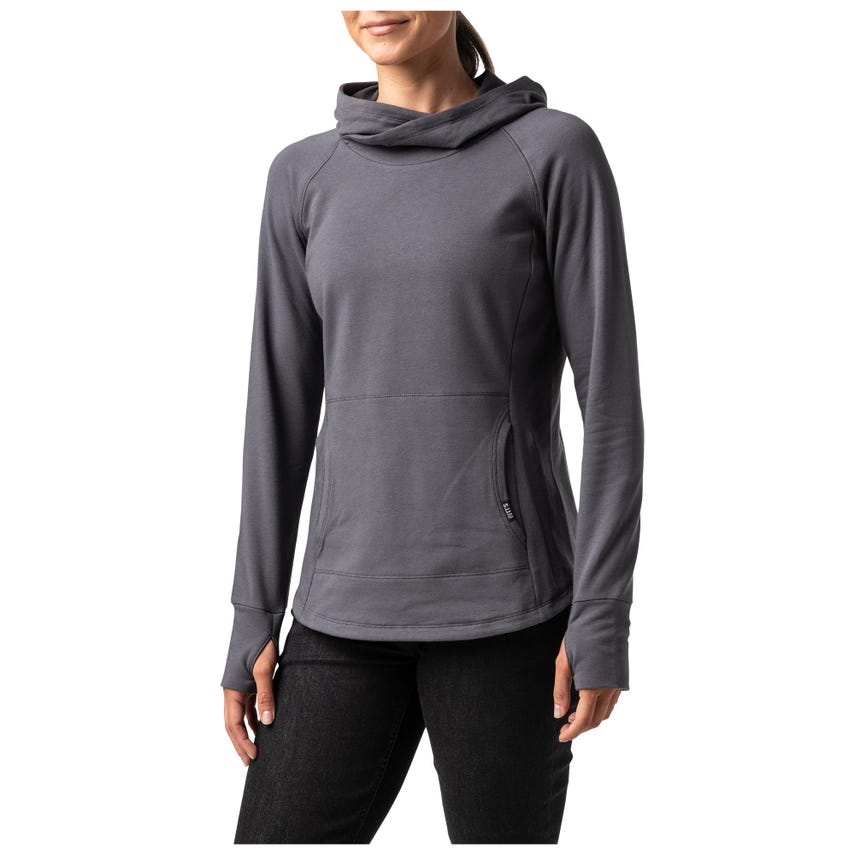 Comfort and utility combined with a unique cross-over opening for warmth and style. The Donna Hoodie is lightweight, durable, and visually appealing. The moisture wicking fabric keeps you dry while thumbholes at the sleeve cuffs and kangaroo front pocket keep your hands warm and cozy. Imported.